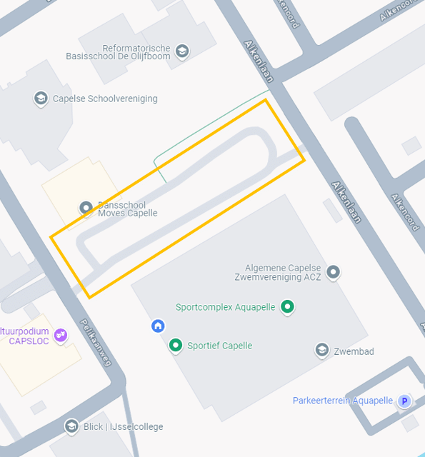 De parkeerplaats bevindt zich tussen sportcomplex Aquapelle en de basisscholen de Olijfboom en CSV.